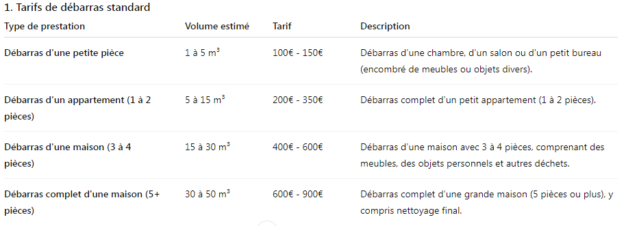 Exemples de tarifs pour débarras